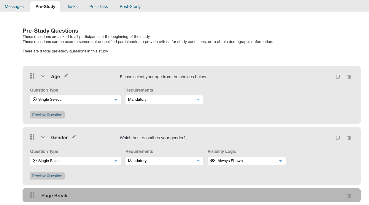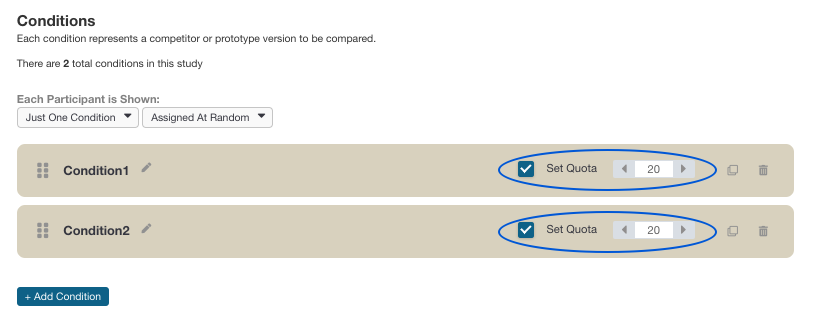 Condition-level quotas define how many participants are assigned to each condition in your study. This is used in between-subjects, within-subjects, and mixed-subjects study designs.