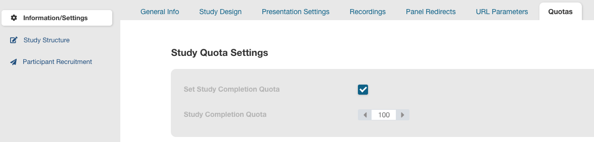 Study-level quotas (also known as Study Completion Quotas or Max Quotas) define the maximum number of participants allowed to take an unmoderated study.
