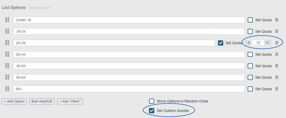 Question-level quotas define the total number of participants who can select a specific response option in a question. These quotas can be found in each individual question by selecting "Set Custom Quotas"